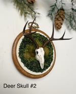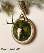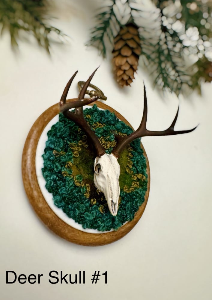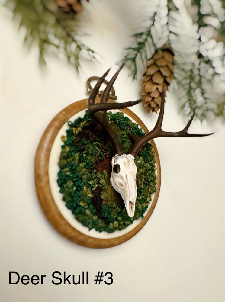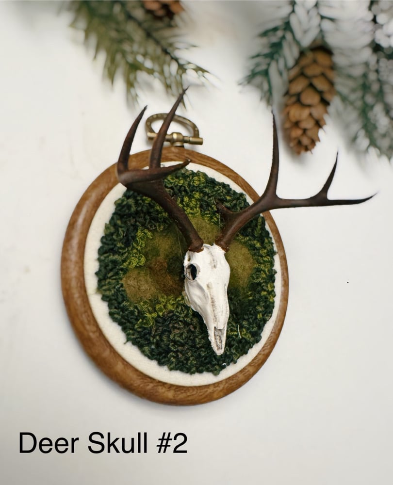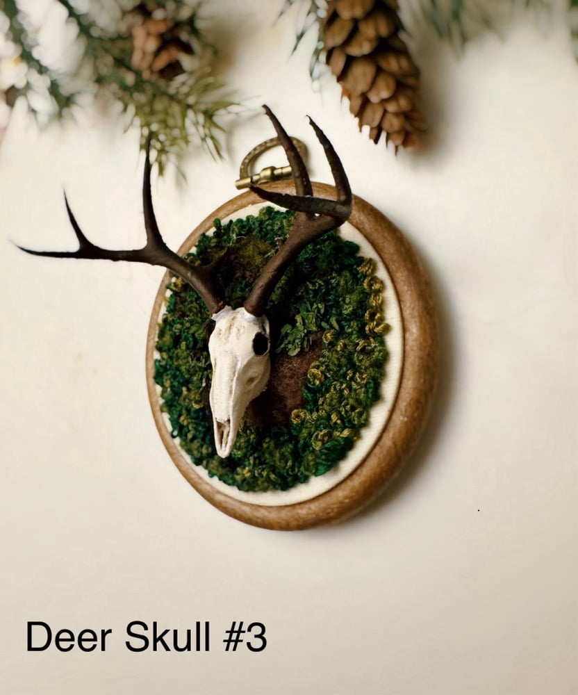 Handmade 3” embroidery hoop ornament featuring a 3D printed deer skull rising from a bed of hand-stitched moss. Each piece is one-of-a-kind, with subtle variations in color and texture that make it uniquely yours.
