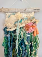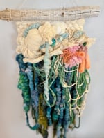 Hand-woven and embroidered with a mix of hand-dyed and hand-spun fibers in shades ranging from deep ocean navy through turquoise, emerald, and seafoam, transitioning to sandy naturals at the top. Dimensional coral elements in coral pink and orange create focal points throughout. Shells, driftwood, and a fishing net are woven into the composition, adding authentic coastal details.