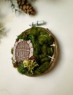 Handmade 3” hoop ornament featuring a tiny fairy door hidden deep in a mossy forest hollow. Rich greens and earthy browns are layered and stitched to create a dimensional landscape that feels like discovering something secret in the woods.
