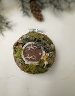 Handmade 3” hoop ornament featuring a tiny round fairy door nestled into a wild, overgrown hillside. Ivy cascades over the archway, contrasting with bright chartreuse and forest green mosses below. Delicate mushrooms and wispy golden fibers add to the untamed, secret-garden feeling.