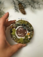 Materials: Wool roving, natural fabric, PHA bioplastic, natural earth pigments, reindeer moss, lichen, wood-look hoop