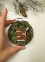 Handmade 3” hoop ornament featuring a tiny fairy door nestled into a shadowy forest hollow. Deep greens and soft mosses create a mysterious, layered landscape with golden accents around the arched doorway. Delicate 3D printed mushrooms grow beside the threshold.