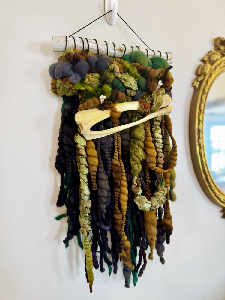 Hand-woven with a rich mix of hand-dyed and hand-spun fibers in shades ranging from charcoal and slate blue through moss green, golden ochre, and earthy browns. Textured roving creates dimensional forest floor depth, while vintage sari silk and natural rope add organic complexity. Real bone crosses at the center, with hand-painted 3D printed mushrooms (made from biodegradable PHA filament) throughout.